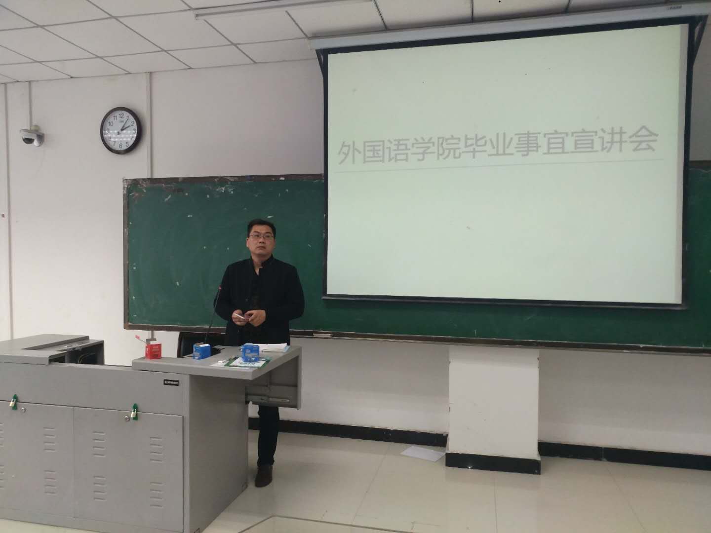 薛天桥老师结合最近几届毕业生的去向,再次向同学们分析了当今的就业形势,他指出,最近几年我院毕业生在外语行业就业比例在不断降低,他希望同学们要将目光转向民营企业以及基层就业,国家在农村教师特岗计划、“三支一扶”、大学生志愿服务西部计划、预征入伍等方面有较多的鼓励政策。