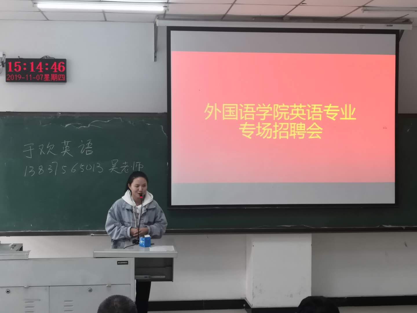 11月7日,威廉williamhill在图书馆L716教室举办了2020届英语专业毕业生招聘会,此次参加招聘会的单位有英语中国网、宝丰红星高中、育人国际学校、于欢英语、山姆大叔英语、河南省蒙博教育信息咨询有限公司、郑州育人教育集团许昌校区、松鼠Al智适教育、清艳教育等。团总支书记袁立文出席了此次活动。