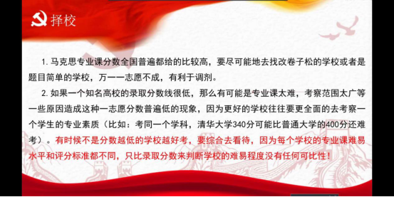 会上,侯歌同学首先从学校的选择、英语一、统考政治、专业课四方面分析,为同学们提出中肯的建议。她重点强调:在选择学校时要注意,并非分数越低的学校越好考,要综合看待;英语一的考试准备时,单词要每天背,去年的真题至少做两遍;政治统考不用提前看书,直接跟着徐涛网课学习两遍;专业课最晚8月份开始背。接着,张珍珠同学从院校专业的确定和各科复习规划两方面进行分享。她着重指出:考研中,心态、自制力、坚持和时间安排很重要。在自由交流发言部分,同学们畅所欲言,两位学姐对同学们的疑问进行了现场解答,同学们也交流了学习心得。