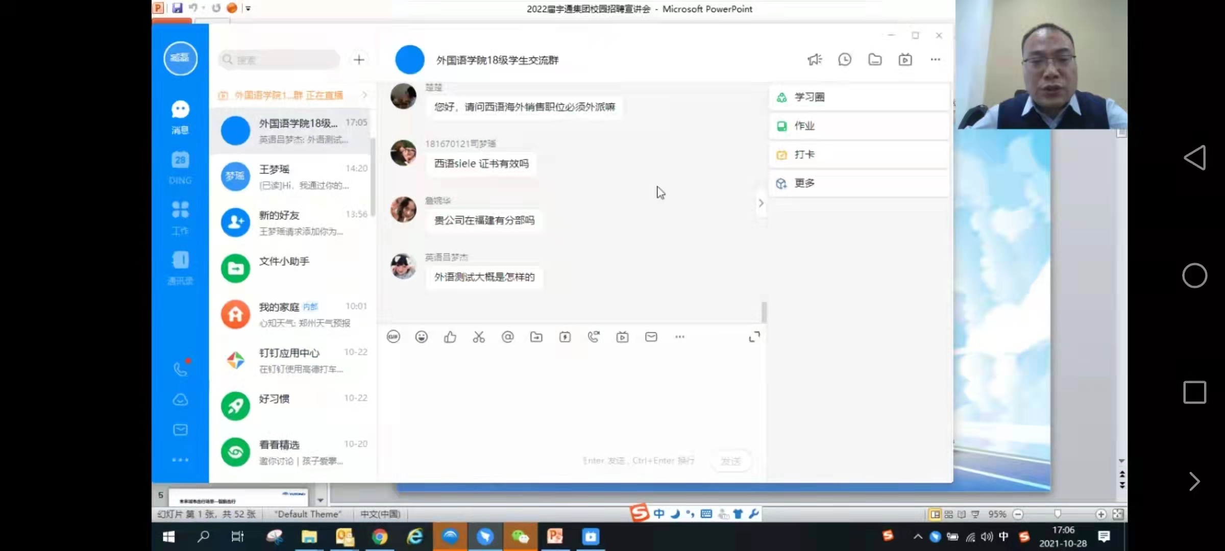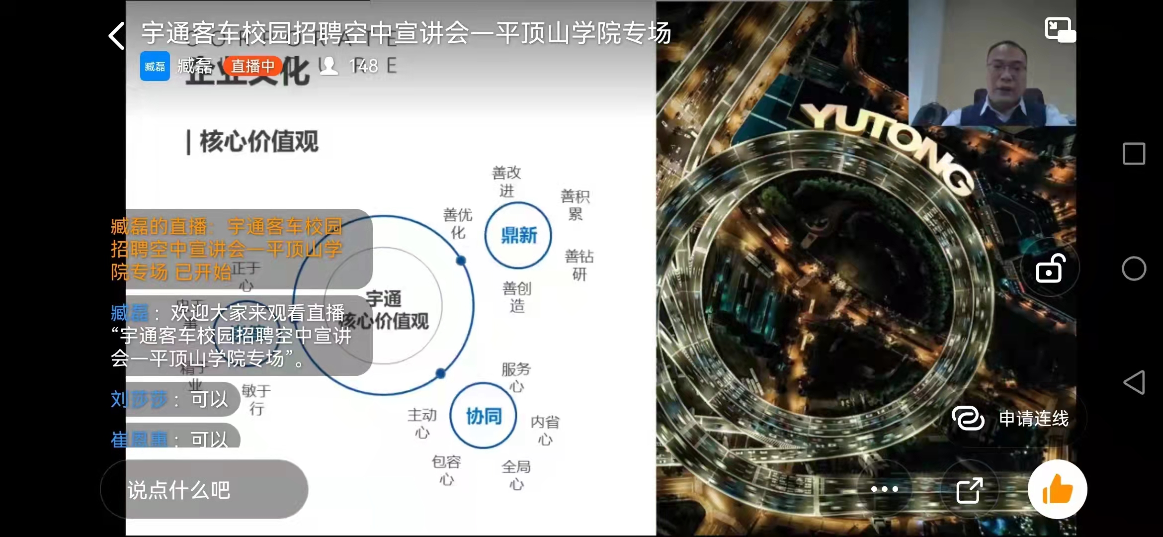 为切实做好威廉williamhill毕业生的就业工作,构建毕业生与用人单位的交流平台,为毕业生提供精准、有效的就业信息和就业服务。10月28日下午,我院于钉钉平台召开宇通集团2022届校园招聘宣讲会。本次招聘会邀请到了宇通集团海外人力资源部负责人臧磊经理为18级学生主讲,18级辅导员老师王梦瑶及威廉williamhill全体2022届毕业生参加了此次会议。