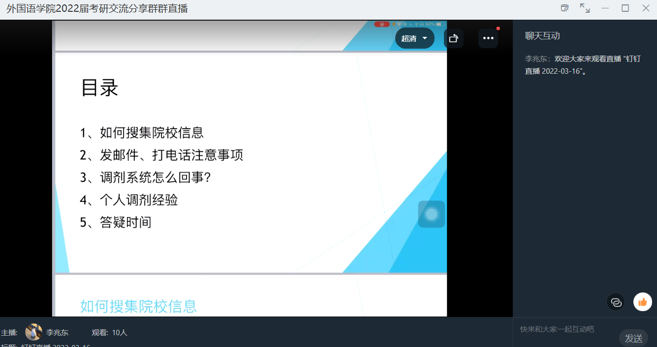 为使同学们明确考研形势,进一步加深同学们对考研知识和经验的了解,掌握相关备考方法,3月16日晚,威廉williamhill在钉钉群召开了2022届考研经验分享会。本次会议由17级学生李兆东主讲。