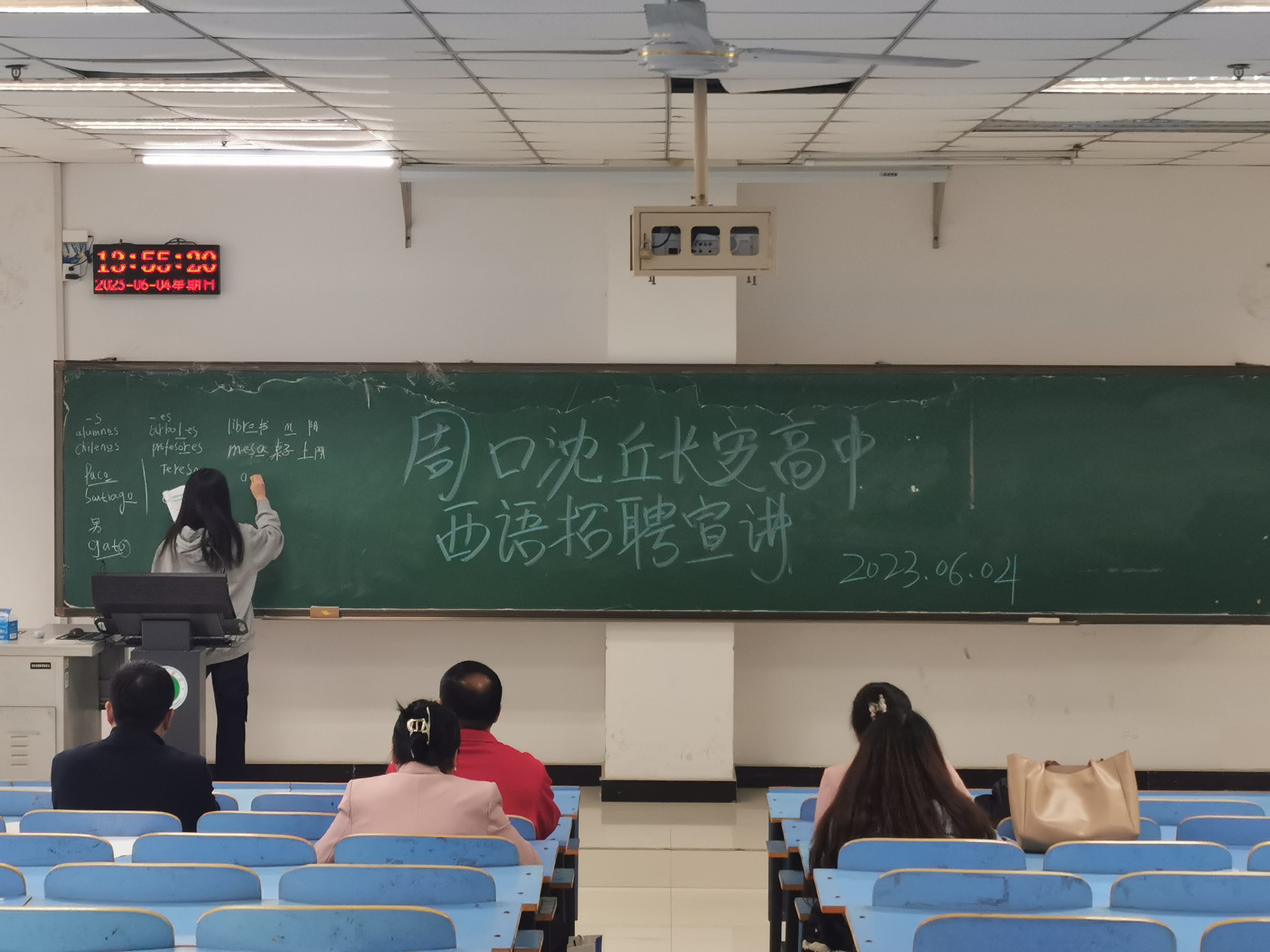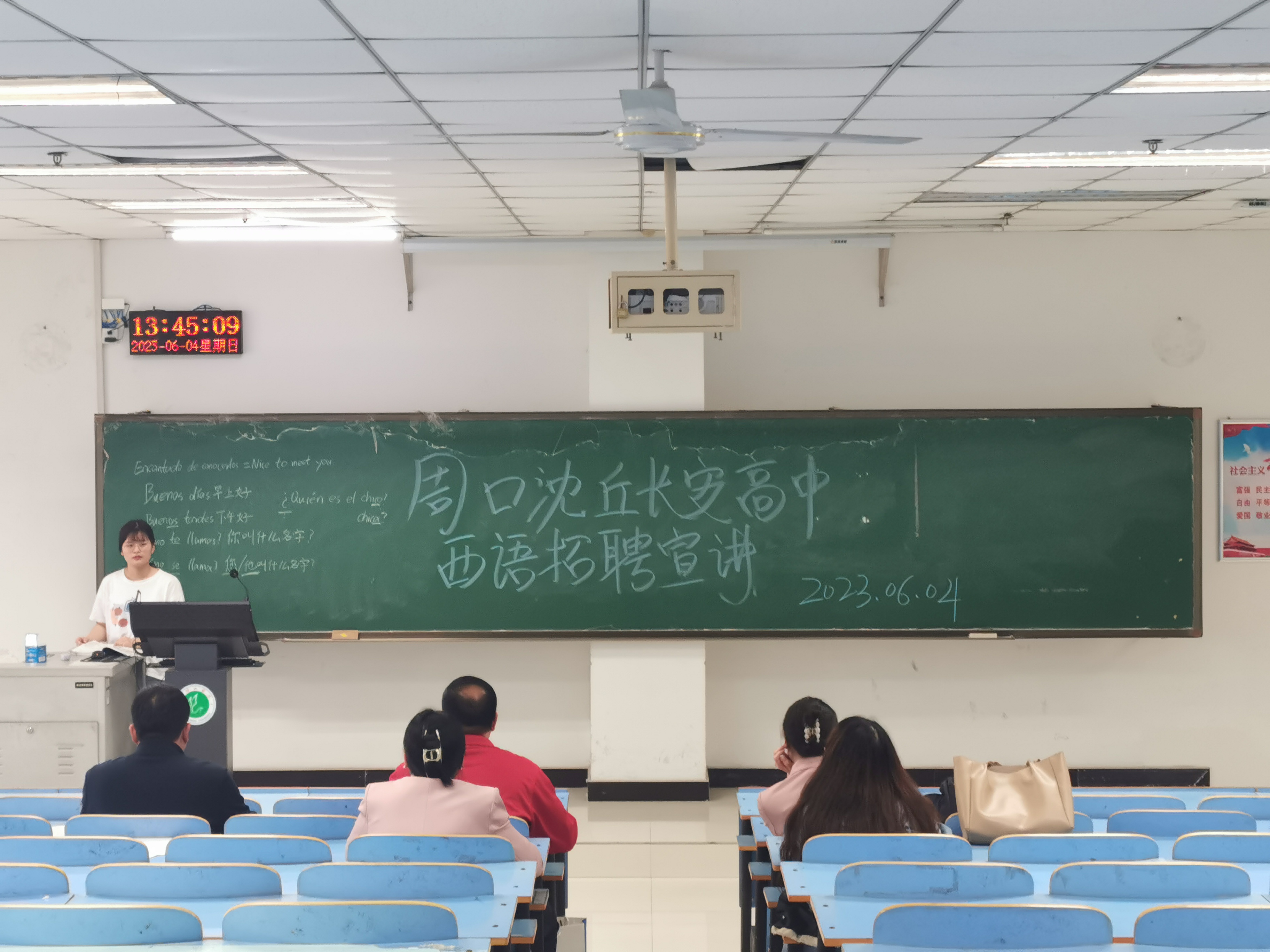 会议伊始,石岩对周口沈丘长安高中招聘人员的到来表示了热烈欢迎和衷心感谢,并鼓励同学们坚定信心,发挥优势,抓住机遇,尽早就业。接着,长安高中的校长欧伟就其办学历史、教学特色和福利待遇做了细致介绍。随后,招聘小组对参与此次宣讲的学生一一进行了西语试讲环节,并给予了详细点评。最后,与三名学生达成初步合作意向。