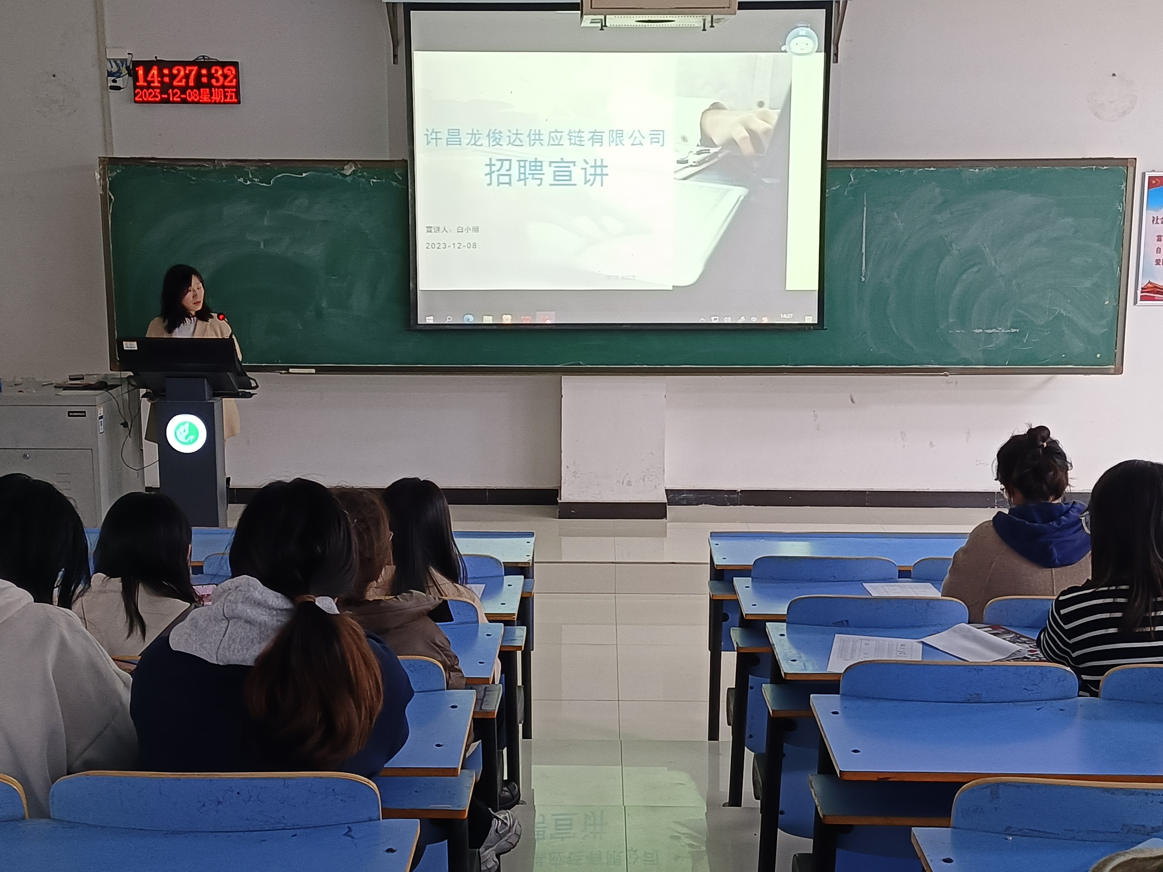 为切实做好毕业生就业工作,拓宽就业渠道,搭建毕业生和用人单位的交流平台,12月8日下午,威廉williamhill于图书馆L716召开了许昌龙俊达供应链管理有限公司校园招聘宣讲会。本次宣讲会由许昌龙俊达公司经理白小丽和潘科卫主讲,威廉williamhill2020级部分学生参加。