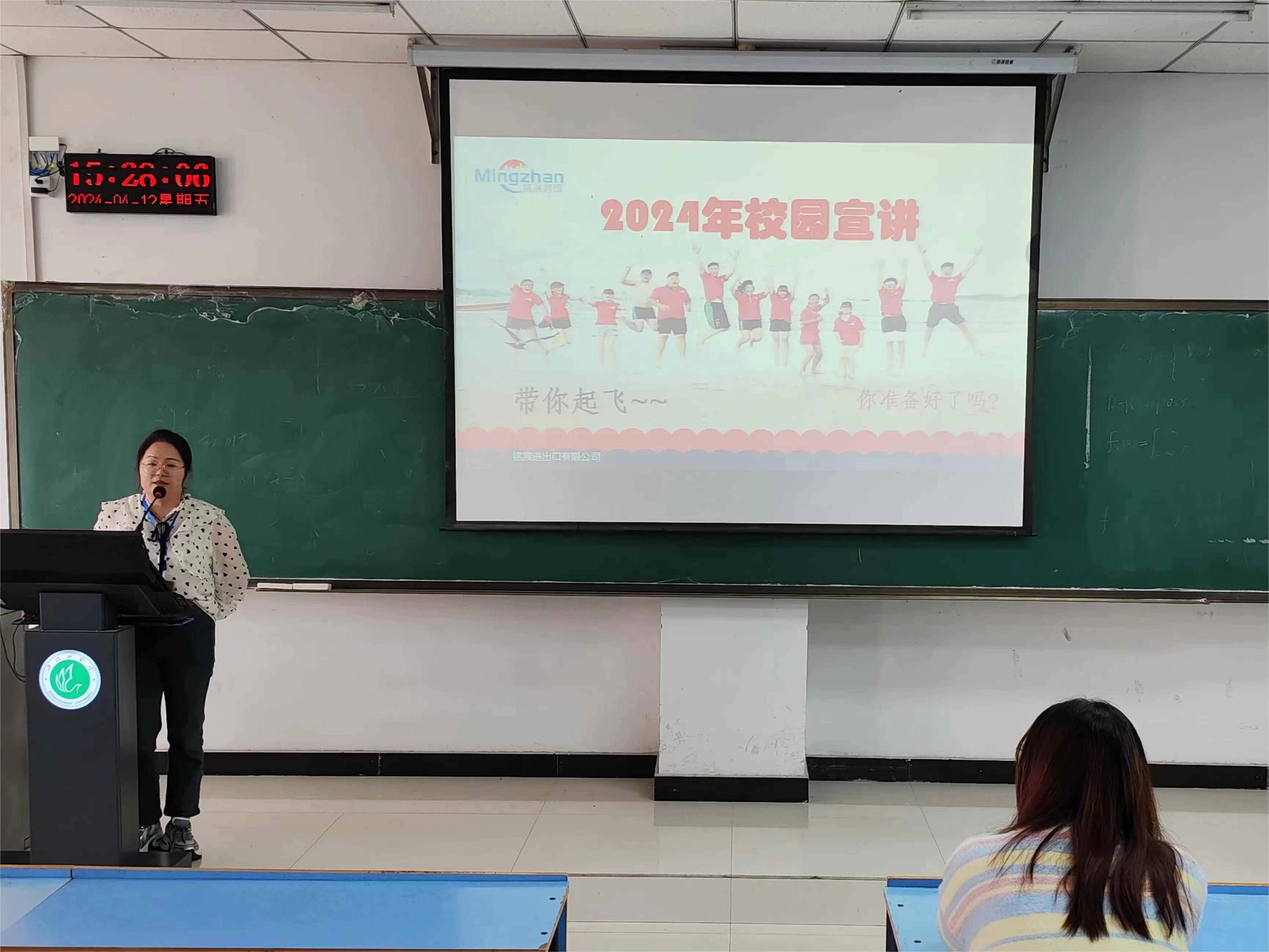 宣讲会伊始,刘芸从公司的发展历程、业务优势及未来规划三个方面展开向同学们详细介绍了公司的基本状况。在公司的业务优势方面,刘芸讲到,义乌铭展进出口有限公司致力于做好外贸工作及传播好中华文化,当前该公司不仅是中国西语服务的推动者,更是引领者。接着,刘芸就公司的工作环境、岗位设置以及荣誉成就向同学们进行了详细介绍,她提到,公司的工作环境良好,待遇丰厚,且对外语专业人才的需求量较大,希望同学们综合考虑自己的个人意愿和实际情况,选择适合自己的工作岗位,积极投递简历。最后,刘芸鼓励同学们积极提出疑问,并针对同学们提出的问题进行了详细的解答,帮助同学们完善对公司培养方向及招聘流程的认识。宣讲会结束后,同学们纷纷表示,在今后的学习与生活中会不断增强自身的综合素质,努力提高自身竞争力,抢抓机遇,为就业做好充分准备。