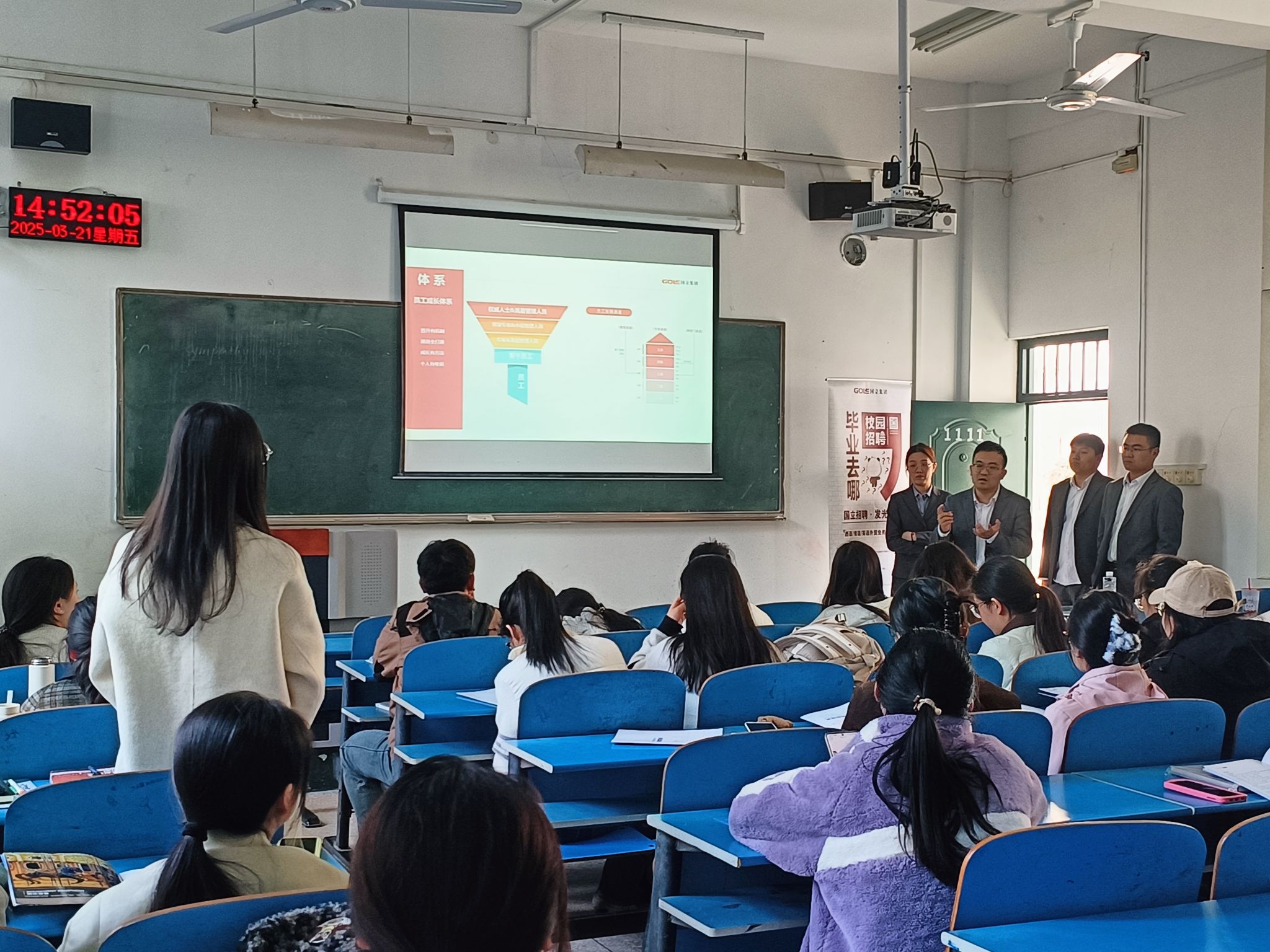 招聘会上,崔璨详细介绍了此次招聘的岗位情况。本次招聘主要针对英语、俄语、西语专业学生,提供运营、售后交付以及外贸业务员等岗位,招聘人数达40人。崔璨强调,国立集团高度重视人才的培养与发展,为员工提供多通道职业发展路径、丰富的培训资源以及具有竞争力的薪酬福利。他还分享了公司的发展历程和企业文化,鼓励同学们积极投身于国际化的工作环境中,实现个人价值与企业发展的双赢。