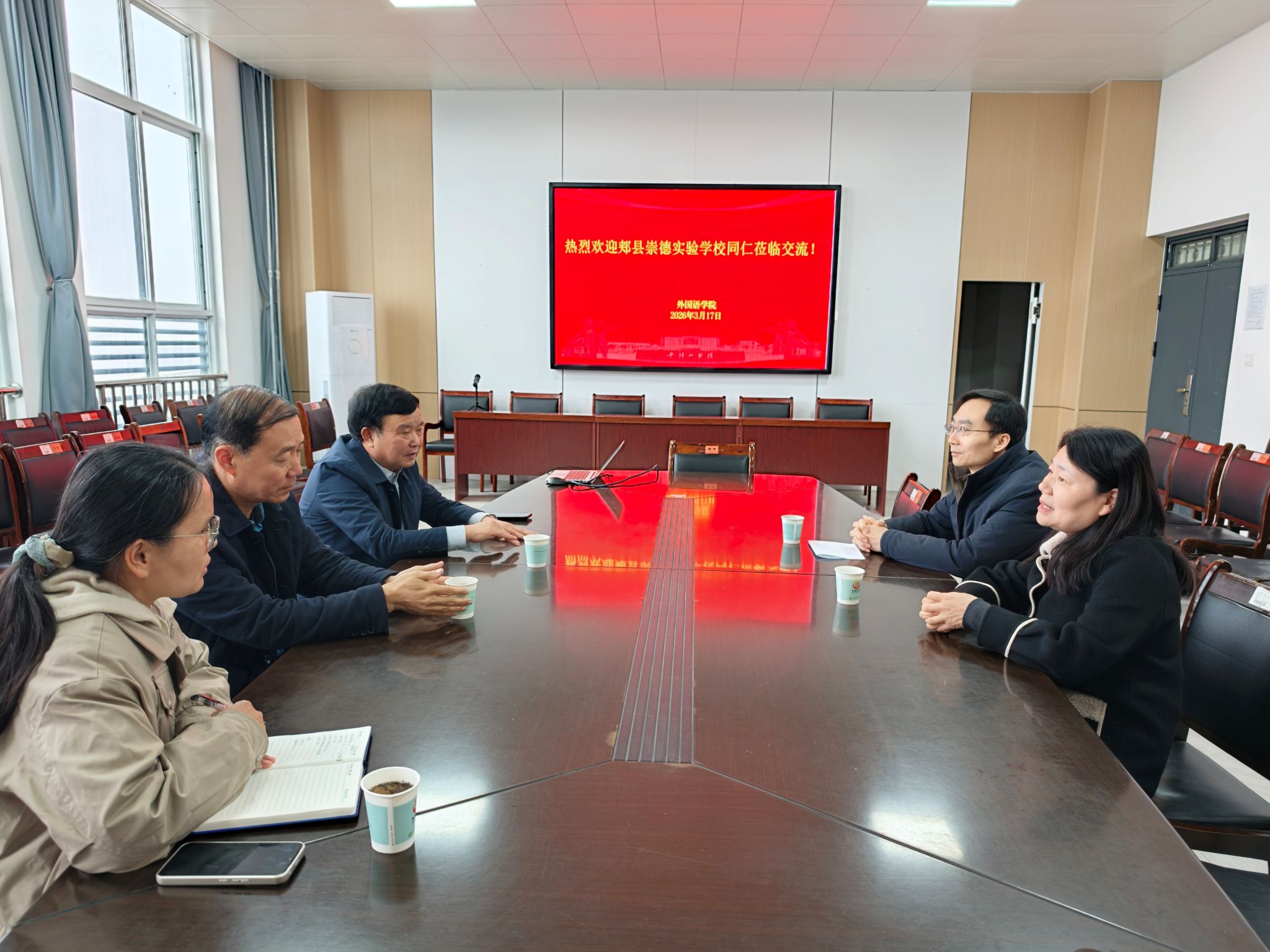 感谢,并介绍了郏县崇德实验学校办学定位、发展现状及师资队伍建设需求。他表示,希望以此次交流为契机,进一步加强两校合作对接,在实习实践基地建设、毕业生就业输送、教师培养培训、学生出国深造规划等方面开展深度合作,实现优势互补、资源共享、共同发展。