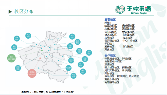 于欢英语专注于 3-12 岁幼少儿英语教育,自 2014 年成立以来,秉承“母语教学”等先进系统的教学理念,迄今为止在河南郑州、平顶山拥有 15 家直营校,其他地区拥有合作校 30 余