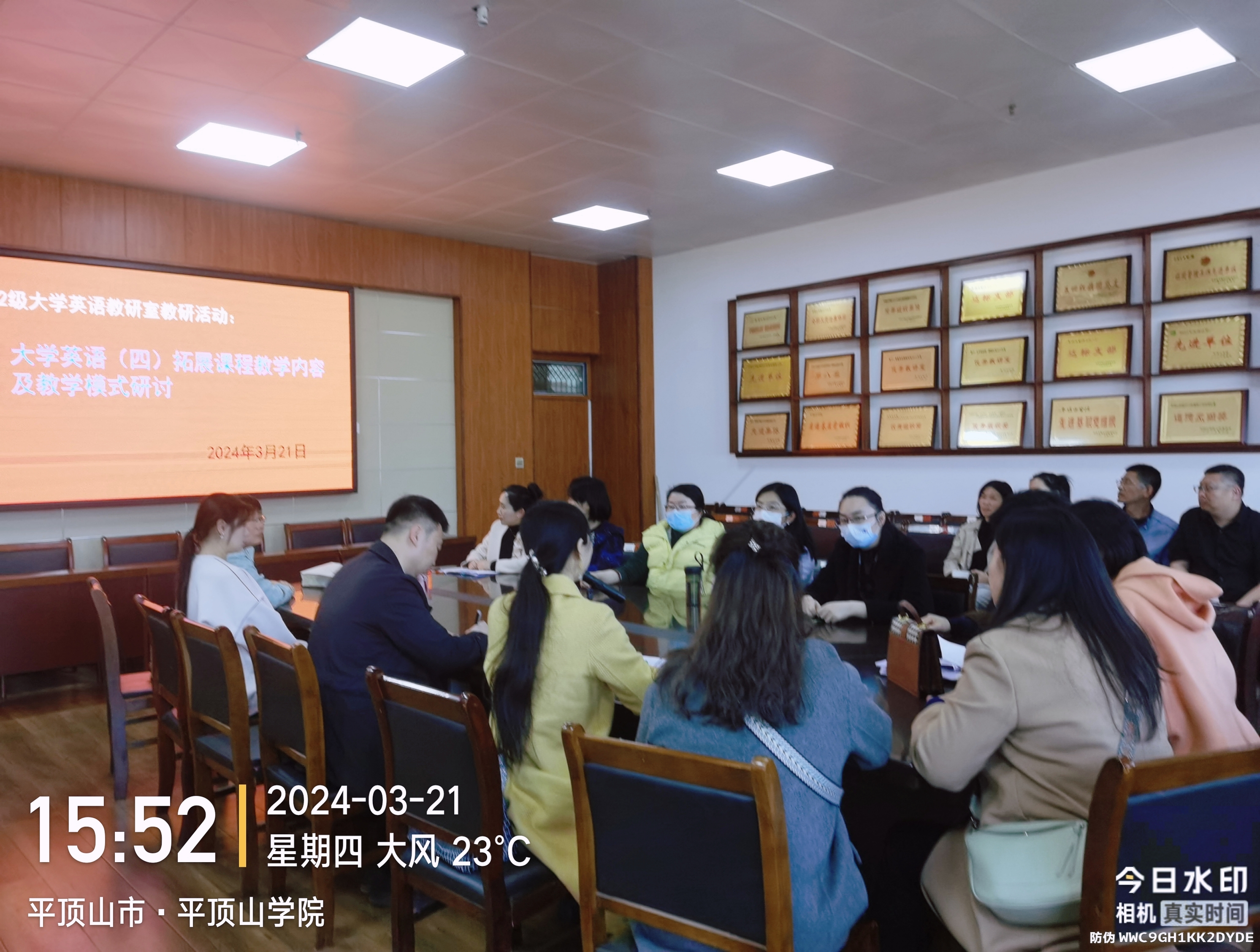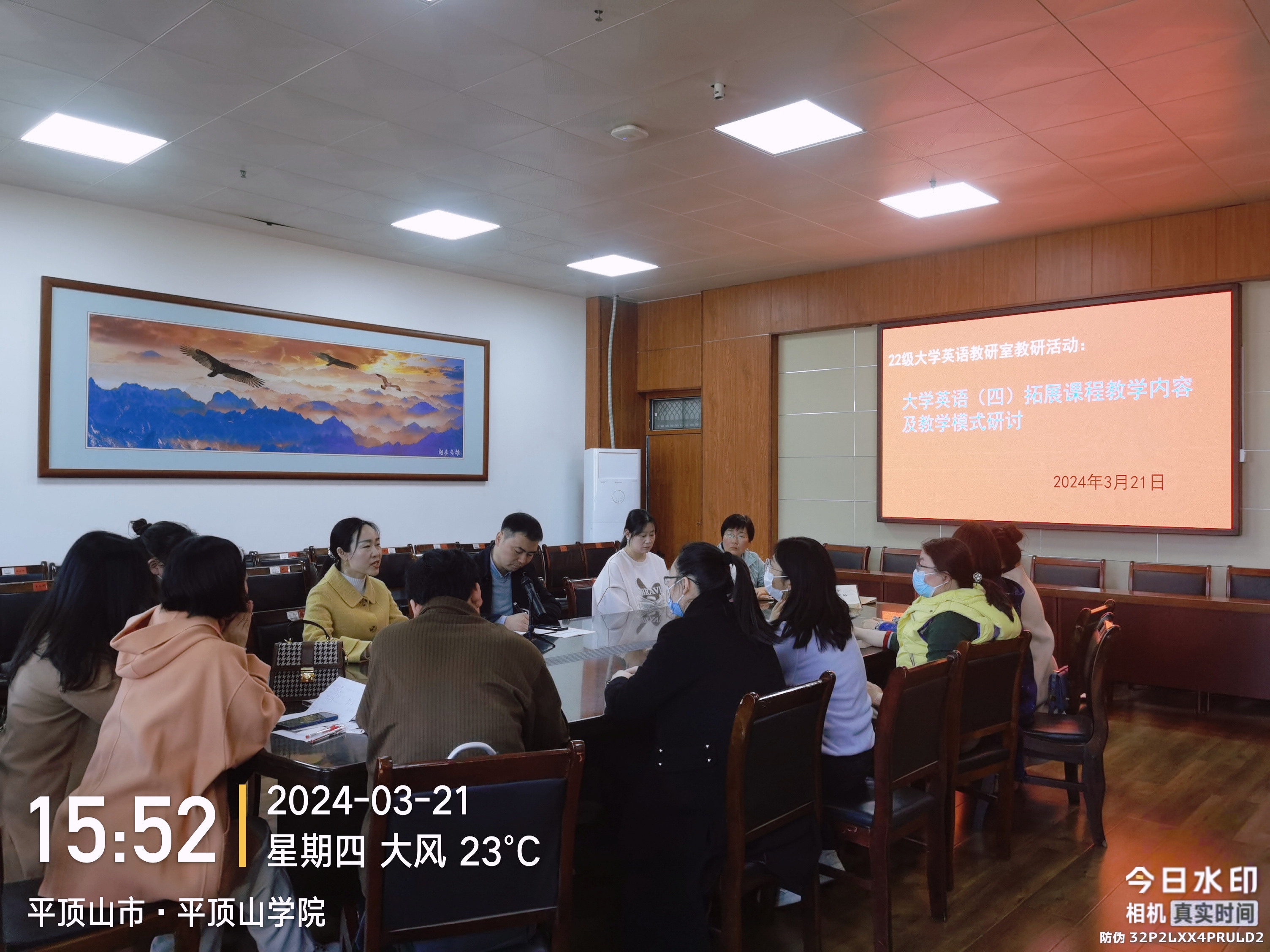3月21日下午,大学英语教研室在图书馆L708会议室开展了新学期第二次教研活动。大学英语教研室22级全体任课教师参加了活动。活动由教研室主任姜慧主持,丁超峰副院长参加活动。此次教研活动主要围绕22级《大学英语(四)》拓展课程教学内容及教学模式展开讨论。李卓、李晓娟、王军辉、郭振献等多位教师分别就自己授课群组的情况提出自己的看法和建议,各位参会教师就上述内容进行了深入探讨。本次教研活动旨在交流本学期《大学英语(四)》教学现状、促进任课教师的教学反思、集思广益优化教学内容和模式,为22级大学英语教学改革提供更全面、更有效、更具针对性的建议与措施,促进大学英语教学质量的进一步提升。